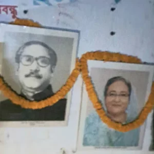 আওয়ামী লীগের পরিত্যক্ত কার্যালয়ে শেখ মুজিব ও শেখ হাসিনার ছবি টাঙিয়ে ফুলের মালা