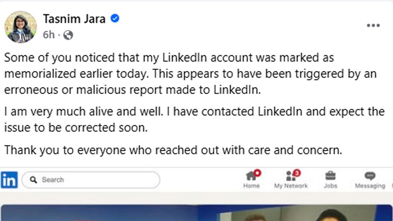 সামাজিক যোগাযোগমাধ্যম লিংকডইনে চিকিৎসক ডা. তাসনিম জারার অ্যাকাউন্ট আজ ‘মেমোরাইলাইজড’ বা মৃত হিসেবে চিহ্নিত করা হয়েছে। এ ঘটনায় সামাজিক যোগাযোগমাধ্যমে নানা মন্তব্য ও আলোচনা ছড়িয়ে পড়ে। এ বিষয়ে সোমবার বিকেলে নিজের ফেসবুক পেজে একটি পোস্ট দেন তাসনিম জারা। পোস্টে তিনি লিখেছেন, অনেকেই লক্ষ্য করেছেন যে আজ সকালে তার লিংকডইন অ্যাকাউন্টটি ‘মেমোরাইলাইজড’ হিসেবে চিহ্নিত করা হয়েছিল। সম্ভবত আমার অ্যাকাউন্টে করা কোনো ভুল বা বিদ্বেষমূলক রিপোর্টের কারণে এমনটি ঘটেছে। তিনি আরও লিখেছেন, আমি বেঁচে আছি এবং সুস্থ আছি। আমি লিংকডইনের সঙ্গে যোগাযোগ করেছি এবং আশা করছি শিগগিরই সমস্যাটির সমাধান হবে।