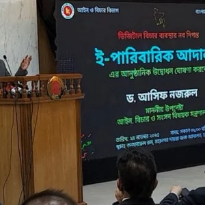 বাংলাদেশে এখন পর্যন্ত সব ধরনের সংস্কার ও পরিবর্তন আইনের মাধ্যমেই এগিয়েছে বলে মন্তব্য করেছেন আইন উপদেষ্টা আসিফ নজরুল। সোমবার ঢাকা মহানগর আদালতে ই-পারিবারিক আদালত কার্যক্রমের উদ্বোধনী অনুষ্ঠানে তিনি এ কথা বলেন। তিনি জানান, পারিবারিক বিরোধের ক্ষেত্রে এখন আর আদালতে যেতে হয় না; লিগ্যাল এইডের মাধ্যমে বিনামূল্যে সেবা পাওয়া যায়। এ প্রক্রিয়ায় একজনের বদলে তিনজন বিচারককে যুক্ত করা হয়েছে বলে উল্লেখ করেন... বিস্তারিত