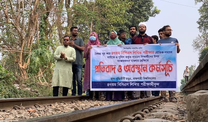 ৪৭তম বিসিএসের লিখিত পরীক্ষা পেছানোর দাবিতে আবারও রেলপথ অবরোধ করে বিক্ষোভ করছেন রাজশাহী বিশ্ববিদ্যালয়ের (রাবি) শিক্ষার্থীরা। এতে দুর্ভোগে পড়েছেন হাজার হাজার রেলযাত্রী।
