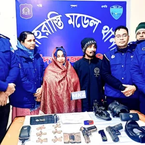 ঢাকার খিলক্ষেত থানা থেকে বৈষম্যবিরোধী ছাত্র আন্দোলনের সময় লুট হওয়া পুলিশের দুটি আগ্নেয়াস্ত্র চাঁদপুরের শাহরাস্তি উপজেলায় উদ্ধার করা হয়েছে। অভিযানটি শুক্রবার (২ জানুয়ারি) রাত ৮টার দিকে শাহরাস্তি পৌরসভার পশ্চিম উপলতার উদ্দিন ব্যাপারী বাড়িতে পরিচালনা করা হয়। পুলিশ জানায়, গোপন সংবাদের ভিত্তিতে অভিযান চালিয়ে একটি ৯ এমএম পিস্তল, একটি ৭.৬২ চায়না পিস্তল, চারটি ম্যাগাজিন, ৩০ রাউন্ড গুলি, পুলিশের পোশাক,... বিস্তারিত