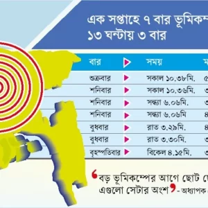 দুই দিনে চার দফা ভূমিকম্প নিয়ে আতঙ্ক না কাটতেই ফের ভূপৃষ্ঠের ঝাঁকুনিতে কাপল বাংলাদেশ। গতকাল বৃহস্পতিবার বিকাল ৪টা ১৫ মিনিটে এ ভূমিকম্প হয় বলে জানিয়েছেন আবহাওয়া অধিদপ্তরের ভূকম্পন পর্যবেক্ষণ কেন্দ্রের কর্মকর্তা রুবাঈয়্যাত্ কবীর। তিনি বলেন, ভূমিকম্পের উত্পত্তিস্থল ছিল ঢাকা থেকে ২৮ কিলোমিটার দূরে নরসিংদীর ঘোড়াশালে। এটি ছিল মৃদু মাত্রার ভূমিকম্প, রিখটার স্কেলে এটি ছিল ৩ দশমিক ৬ মাত্রার। এর আগে... বিস্তারিত