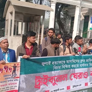 জুলাই গণ-অভ্যুত্থানের সময় সংঘটিত মানবতাবিরোধী অপরাধের মামলায় আসামিকে জামিন দেওয়ার প্রতিবাদে বিপ্লবী ছাত্র-জনতার ব্যানারে একদল জনতা ‘ট্রাইব্যুনাল ঘেরাও কর্মসূচি’ পালন করছে। সোমবার (১২ জানুয়ারি) দুপুরে হাইকোর্টের প্রধান ফটকের সামনে তাদের এ কর্মসূচি পালন করতে দেখা যায়।