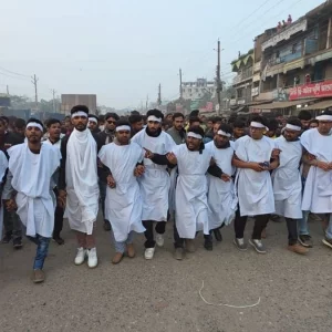 ঝিনাইদহ-৪ আসনে রাশেদ খাঁনের মনোনয়ন প্রত্যাহারের দাবিতে কাফনের কাপড় পরে বিক্ষোভ