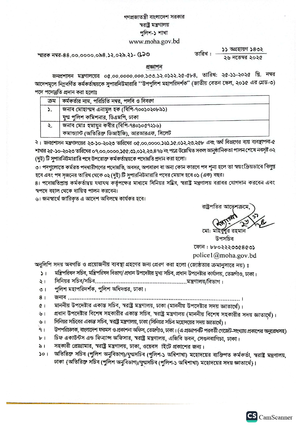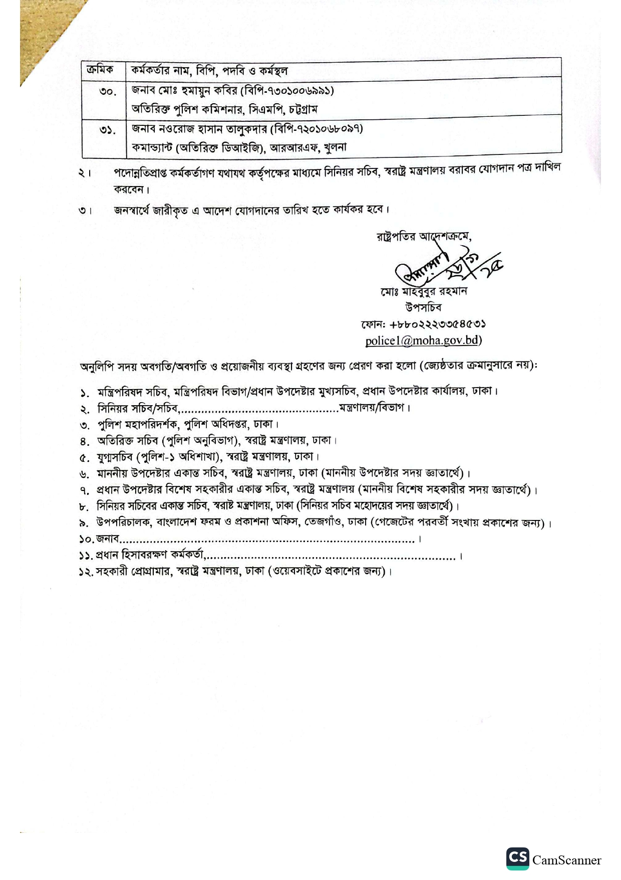 রাষ্ট্রপতির আদেশক্রমে স্বরাষ্ট্র মন্ত্রণালয়ের জননিরাপত্তা বিভাগের পুলিশ-১ শাখার উপসচিব মো. মাহাবুবুর রহমান প্রজ্ঞাপন দুইটিতে স্বাক্ষর করেছেন।
