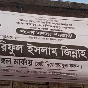 ত্রয়োদশ জাতীয় সংসদ নির্বাচনের সপ্তাহ খানেক আগে হঠাৎ নির্বাচন থেকে সরে দাঁড়ানোর ঘোষণা দিয়েছেন বগুড়া-২ আসনের জাতীয় পার্টির প্রার্থী ও সাবেক এমপি বীর মুক্তিযোদ্ধা শরিফুল ইসলাম জিন্নাহ। শুক্রবার (৬ ফেব্রুয়ারি) বিষয়টি নিশ্চিত করেছেন তার ছেলে তাজবীর শরীফ সাম্য বিষয়টি নিশ্চিত করেছেন। তিনি বলেন, নিরাপত্তাহীনতার কারণে আমার বাবা দাঁড়িয়েছে। নির্বাচন বর্জনের ঘোষণায় শরিফুল ইসলাম জিন্নাহর বরাতে একটি চিঠি... বিস্তারিত