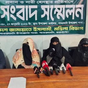 বরগুনার পাথরঘাটায় দাঁড়িপাল্লা প্রতীকের পক্ষে প্রচারণায় বাধা প্রদান ও নারী হেনস্থার অভিযোগে সংবাদ সম্মেলন করেছে বাংলাদেশ জামায়াতে ইসলামী পাথরঘাটা উপজেলা মহিলা বিভাগ। বুধবার (২৮ জানুয়ারি ২০২৬) পাথরঘাটায় আয়োজিত সংবাদ সম্মেলনে লিখিত বক্তব্য পাঠ করেন উপজেলা মহিলা বিভাগের সেক্রেটারি ইরানী আক্তার।  লিখিত বক্তব্যে তিনি অভিযোগ করেন, বরগুনা-২ আসনে জামায়াতে ইসলামীর প্রার্থী ডা. সুলতান আহমদের... বিস্তারিত