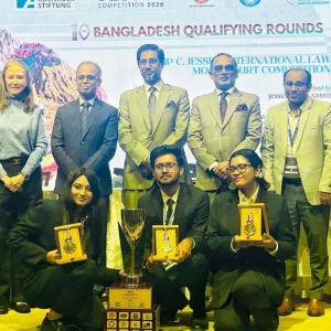 ফিলিপ সি. জেসাপ আন্তর্জাতিক আইন মুট কোর্ট প্রতিযোগিতা ২০২৬-এর ১০ম বাংলাদেশ কোয়ালিফাইং এর ফাইনাল রাউন্ডে ঢাকা বিশ্ববিদ্যালয়ের আইন বিভাগের মুট কোর্ট দলকে হারিয়ে চ্যাম্পিয়ন হয়েছে ইস্টার্ন ইউনিভার্সিটি মুট কোর্ট দল এবং সেই সাথে উত্তীর্ণ হয়েছে আন্তর্জাতিক রাউন্ডে। এর মাধ্যমে ইস্টার্ন ইউনিভার্সিটি আবারও আন্তর্জাতিক অঙ্গনে বাংলাদেশের প্রতিনিধিত্ব করতে যাচ্ছে। চ্যাম্পিয়ন দলটিতে গবেষক হিসেবে ছিলেন... বিস্তারিত