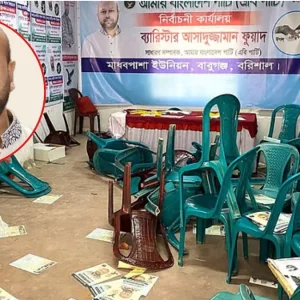 বরিশাল-৩ (বাবুগঞ্জ–মুলাদী) ১১–দলীয় জোট সমর্থিত আমার বাংলাদেশ পার্টির (এবি) সাধারণ সম্পাদক মোহাম্মদ আসাদুজ্জামান ভুইয়ার (ফুয়াদ) নির্বাচনী কার্যালয় ভাঙচুরের ঘটনা ঘটেছে। প্রার্থীর অভিযোগ, বিএনপির নেতা-কর্মীরা এই ভাঙচুর চালিয়েছেন।