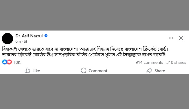 বিশ্বকাপ খেলতে ভারতে যাবে না বাংলাদেশ স্বাগত জানিয়ে আসিফ নজরুলের পোস্ট