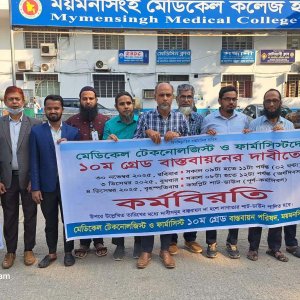 দশম গ্রেডের দাবিতে দুই ঘণ্টা কর্মবিরতি পালন করেছেন ময়মনসিংহে মেডিক্যাল টেকনোলজিস্ট ও ফার্মাসিস্টরা।