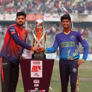 পর্দা নামছে বিপিএলের দ্বাদশ আসরের। শুক্রবার (২৩ জানুয়ারি) শিরোপা জয়ের লড়াইয়ে মাঠে নামছে চট্টগ্রাম রয়্যালস ও রাজশাহী ওওয়ারিয়র্স। এমন হাইভোল্টেজ ম্যাচে টস জিতে রাজশাহীকে ব্যাটিংয়ে পাঠিয়েছেন চট্টগ্রামের অধিনায়ক মেহেদী হাসান। লিগপর্বে দুইবারের দেখায় রাজশাহী ও চট্টগ্রাম একটি করে ম্যাচ জিতেছে। শীর্ষে থেকে নাজমুল হোসেন শান্তর রাজশাহী এবং শেখ মেহেদীর চট্টগ্রাম প্লে-অফে নামে টেবিলের দুইয়ে থেকে। ফলে... বিস্তারিত