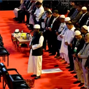 সমাবেশ মঞ্চেই নামাজ আদায় করলেন তারেক রহমান