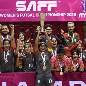 প্রথমবারের মতো অনুষ্ঠিত হয়েছে নারী ও পুরুষ সাফ ফুটসাল চ্যাম্পিয়নশিপ। যেখানে প্রথমবারেই বাজিমাত করেছে বাংলাদেশের মেয়েরা। অপরাজিত চ্যাম্পিয়ন হয়েছে সাবিনা খাতুনের দল। বৃহস্পতিবার (২৯ জানুয়ারি) শিরোপা নিয়ে দেশে ফিরেছে নারী ফুটসাল দল। সন্ধ্যা সোয়া ৬টায় দেশের মাটিতে পা রাখেন তারা।