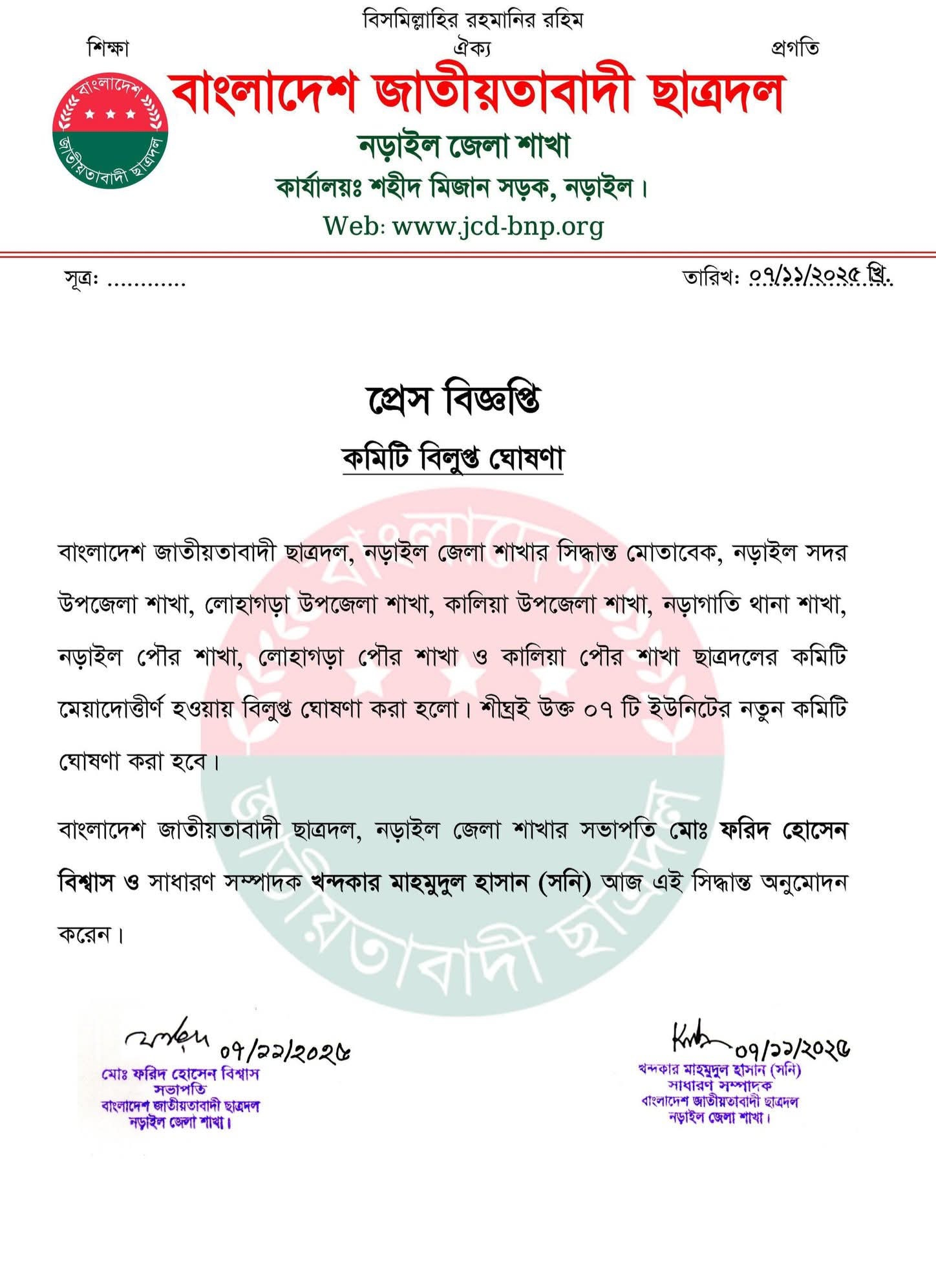 বাংলাদেশ জাতীয়তাবাদী ছাত্রদল নড়াইল জেলা শাখার সভাপতি ফরিদ হোসেন বিশ্বাস ও সাধারণ সম্পাদক খন্দকার মাহমুদুল হাসান (সনি) এই সিদ্ধান্ত অনুমোদন করেন বলেও প্রেস বিজ্ঞপ্তিতে উল্লেখ করা হয়েছে।