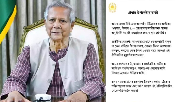 জুলাই সনদ স্বাক্ষর অনুষ্ঠান সরাসরি সম্প্রচারের আহ্বান প্রধান উপদেষ্টার