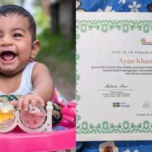 প্রথমবারের মতো বাংলাদেশে ‘কার্বন-নিউট্রাল শিশু’ হিসেবে আন্তর্জাতিক স্বীকৃতি পেয়েছে সাতক্ষীরার তালা উপজেলার শিবপুর গ্রামের শিশু আয়ান খান রুহাব। মাত্র ৮ মাস বয়সেই এই বিশেষ স্বীকৃতি অর্জন করেছে রুহাব।