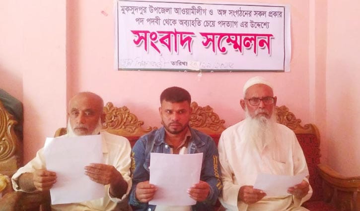 গোপালগঞ্জের মুকসুদপুরে সংবাদ সম্মেলন করে দলীয় পদ-পদবি থেকে পদ্যত্যাগ করেছেন কার্যক্রম নিষিদ্ধ আওয়ামী লীগের আরো তিন নেতা।
