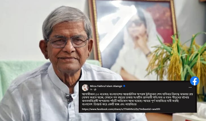 গত বছরের জুলাইয়ে গণঅভ্যুত্থানের সময় সংঘটিত মানবতাবিরোধী অপরাধের অভিযোগে ক্ষমতাচ্যুত প্রধানমন্ত্রী শেখ হাসিনার বিরুদ্ধে করা একটি মামলার রায় ঘোষণা করা হবে সোমবার (১৭ নভেম্বর)। এ মামলায় ‘পূর্ণ ন্যায়বিচার ও স্বচ্ছতা`র দাবি জানিয়েছেন বিএনপির মহাসচিব মির্জা ফখরুল ইসলাম আলমগীর।