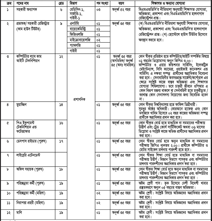 বাংলাদেশ সেনাবাহিনী পরিচালিত আর্মি মেডিকেল কলেজ, চট্টগ্রামে ১২টি পদে ২২ জন শিক্ষক-কর্মচারী নিয়োগ দেওয়া হবে। আগ্রহীরা আগামী ১৮ নভেম্বর পর্যন্ত আবেদন করতে পারবেন। আবেদনপত্র ডাকযোগে অথবা কুরিয়ার সার্ভিসের মাধ্যমে পাঠাতে হবে।